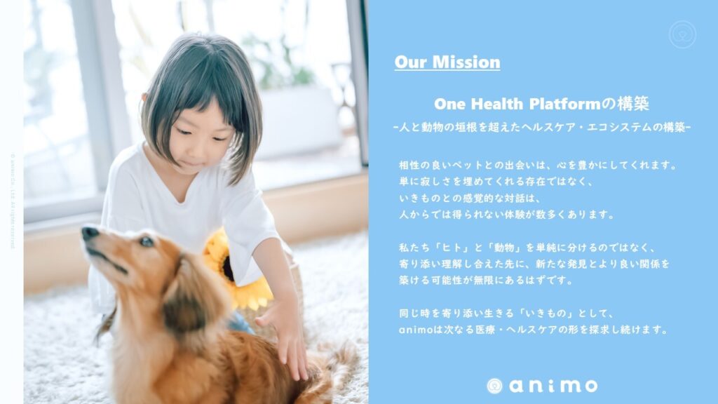 ペットも人のように疾患の多様化、専門性が進み、“人医療と獣医療の連携”・“動物病院間、動物病院-飼い主間の情報連携”が急務であると私たちは考えています。そこで、「人と動物の垣根を超えたヘルスケア・エコシステムの構築(One Health Platform)」をMissionとしてanimo株式会社を設立しました。私たちは、「ヒト」、「動物」を動物種で単純に分けるのではなく、医療資源を共有し共に病気に向き合い、寄り添い理解し合えた先に、医療・ヘルスケアの新たな発見があるものと信じています。そのためのプロダクト、サービスを私たちは提供していきます。